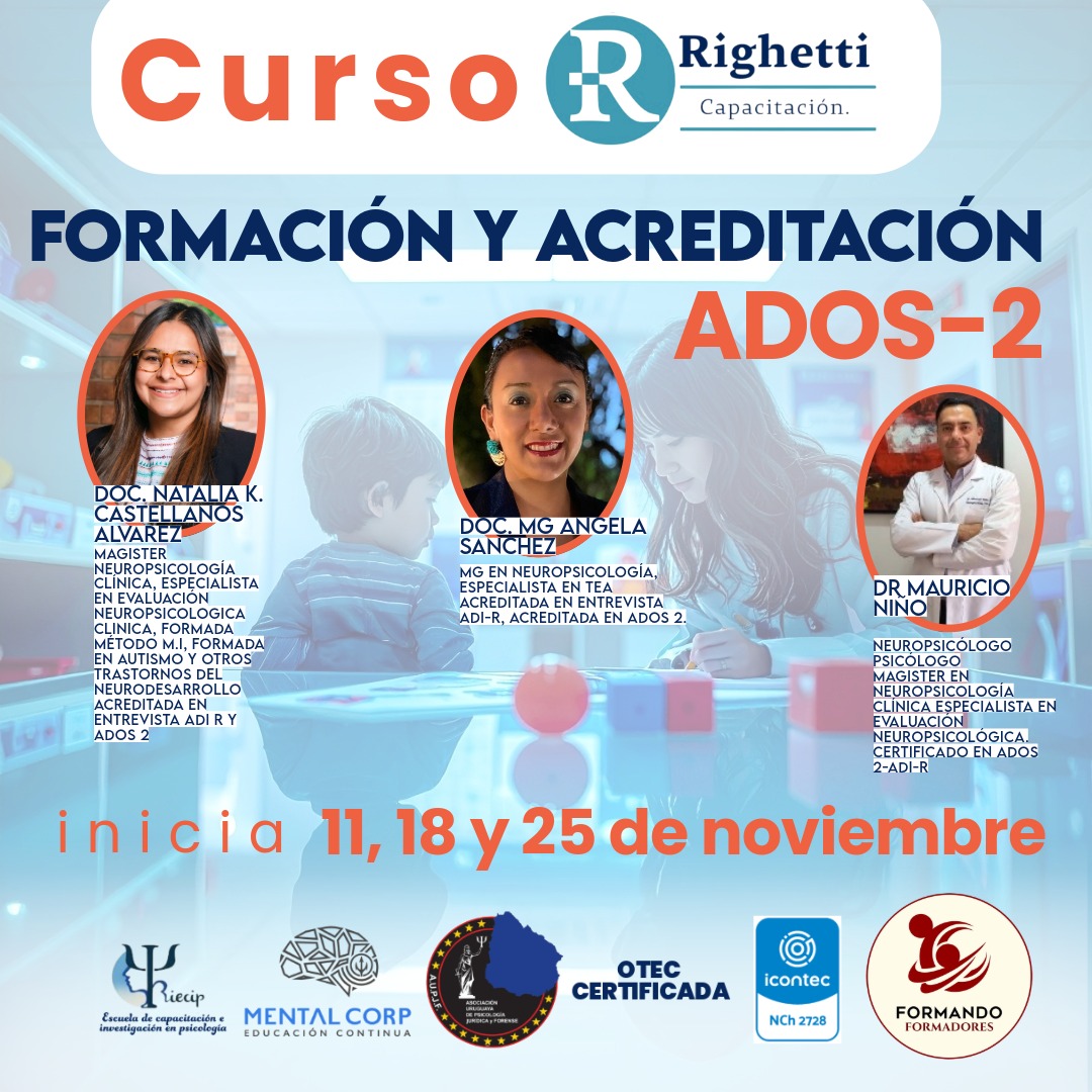 Mg. ANGELA Sanchez. Magíster en Neuropsicología. Directora de la clínica Neurorehabilitar en Colombia y Miami. Especialista en TEA. Acreditada en entrevista ADI R y ADOS 2., por la Universitat de Barcelona, habilitada para la instrucción, siendo ella quien certifica el curso en el certificado.